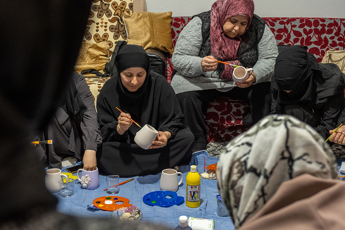 12 yıldır Türkiye’de yaşayan 32 yaşındaki beş çocuk annesi Ayşe, Hayata Destek’in destek grubu oturumu katılımcılarından. Danışanların önerisi üzerine bugünkü oturumda kendileri ve eşleri için birer kupa boyuyorlar. Ayşe, hafta içinde kendine alan yaratabildiği tek anın bu destek grubu oturumu olduğunu söylüyor. “Bu oturumlardan sonra eve enerjik dönüyorum,” diyor.